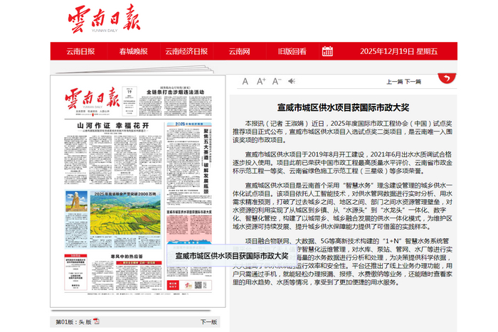 - 《云南日?qǐng)?bào)》頭版:宣威市城區(qū)供水項(xiàng)目獲國際市政大獎(jiǎng)